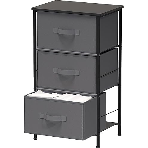 The design combines a powder-coated steel frame with a durable top panel and three fabric drawers, providing practical storage in a compact footprint. It is suitable for bedrooms, closets, hallways, entryways, and light home office organization needs.