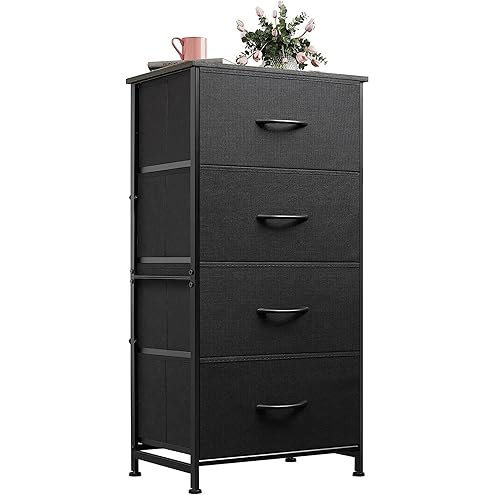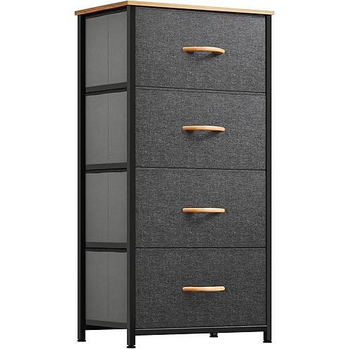 The design combines a powder-coated steel frame with a wood-look top panel and four fabric bins, providing practical vertical storage in a compact footprint. It is suitable for bedrooms, closets, hallways, and entryways where space-efficient organization is required.