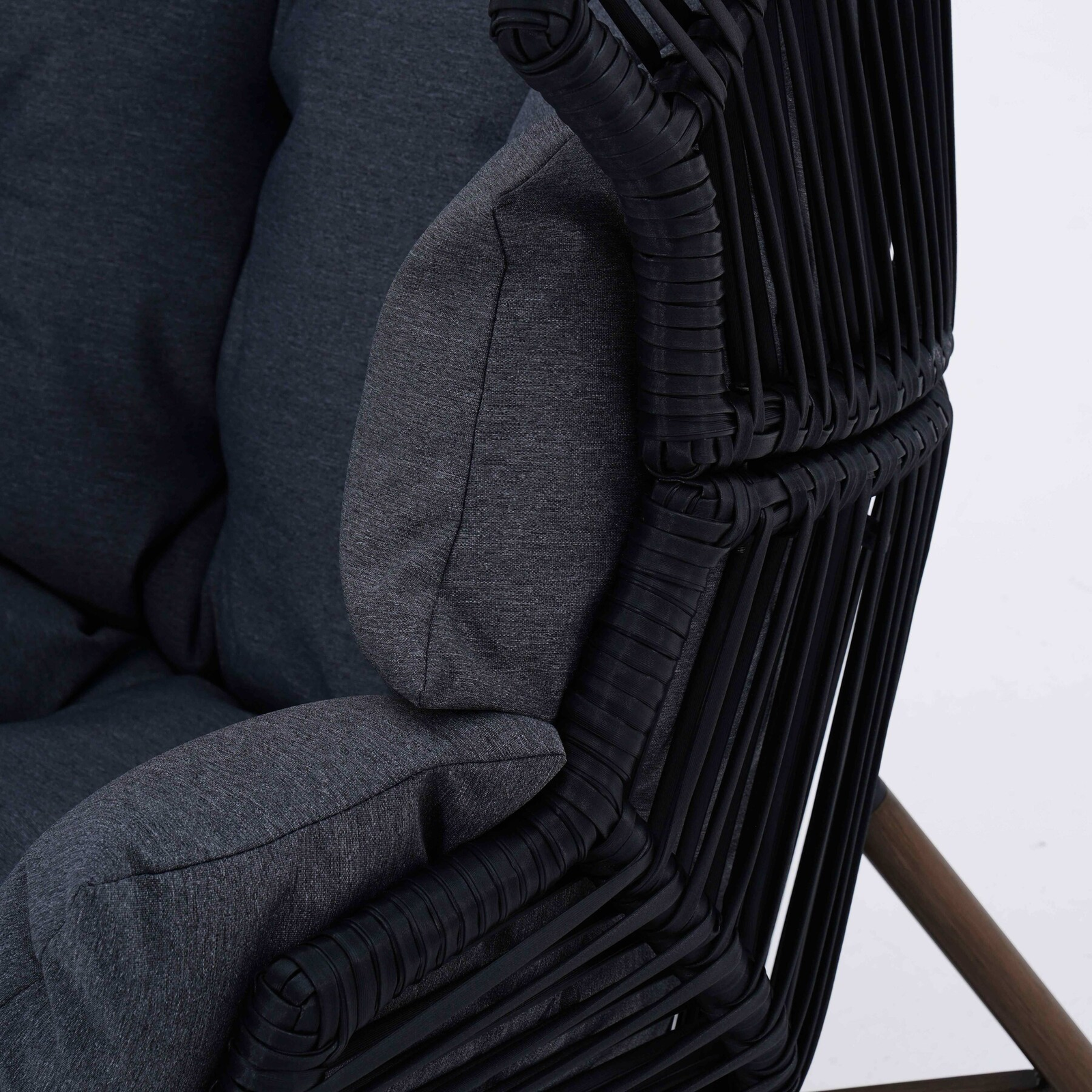 The design combines a powder-coated steel frame with PE rattan weaving, creating a relaxed bohemian style while maintaining structural stability for outdoor use. A suspended egg-shaped seat offers an immersive and comfortable lounging experience.