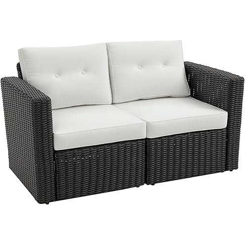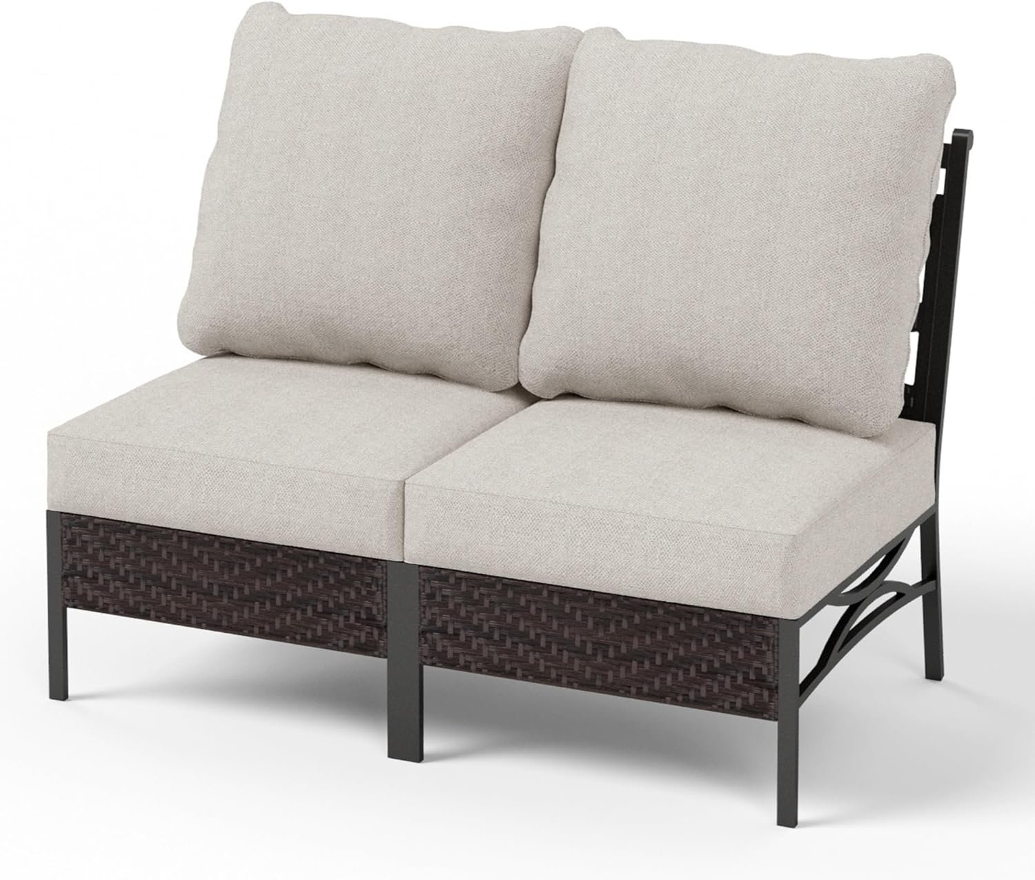 The design combines a durable metal frame with hand-woven PE rattan panels and thick outdoor cushions, creating a balanced solution between comfort, structure, and weather resistance. The two-piece configuration allows flexible placement and integration into larger outdoor living programs.